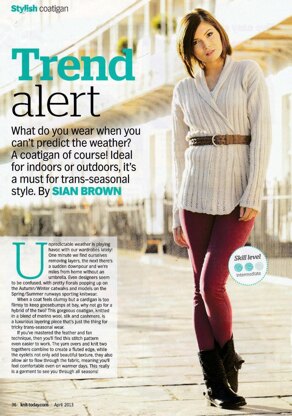 This is a pattern for a Rib Lace Cardigan, originally published in Knit Today. It is a simple lace rib stitch, with a shawl collar, garter stitch edges. The yarn has now been discontinued but any yarn knitting to the tension can be used. The Baby version of the yarn is a good alternative. Photos Knit Today.