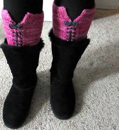 These ribbed boot cuffs are knit flat and then laced up like a corset in the final step. They’ll add a special funky touch to whatever boots you wear and can even be worn just as legwarmers or spats above your shoes.