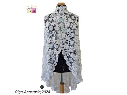Lace wedding cape with scarf . Modern crochet Irish lace pattern . A detailed pattern for all crochet motifs - a graphic diagram, a photo and a verbal description of each crochet row. PDF file for 80 pages Design work by Starostina Olga.