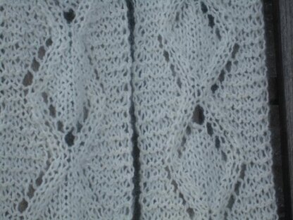 I wanted to design a lacey scarf, with a single motif, and I wanted to use Garter stitch as the background stitch. I used extra big needles so that it would knit up quickly. This would be a nice quick gift.