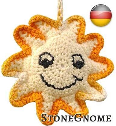 Sie wird 7-8 cm groß, wenn Sie sehr feines Baumwollgarn verwenden. Wählen Sie dickeres Garn und eine größere Häkelnadel für eine größere Sonne. *(Wenn Sie ein Garn mit der Lauflänge von 60 – 120 m/50 g und eine 5er Häkelnadel verwenden, wird die Sonne ca. 16 cm groß.)