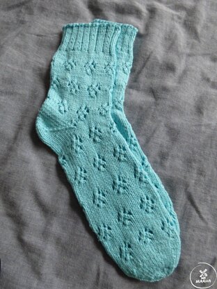 This is a knitting instruction for cotton socks with a mock boomerang heel (without short rows) and a lace pattern. It includes a pattern chart and a comprehensive - stitch by stitch - written instruction.