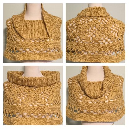 | One size only: | one size fits most: The completed capelet is about 15” high by 21” wide and the bottom edge. It tapers slightly up toward the neck. The ribbing is about 5.5” high. Motifs are designed to stretch. |