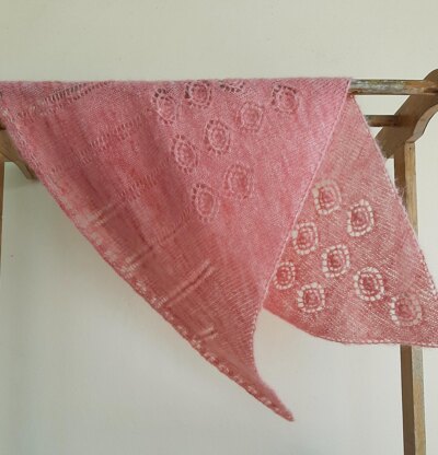 This triangular shawl is knit from the bottom point up, with increases worked at the edges of all right-side rows. A section of Circles stitch pattern is followed by vertical columns of central double decreases – and the shawl is finished with a modified Victorian edging along the topline.