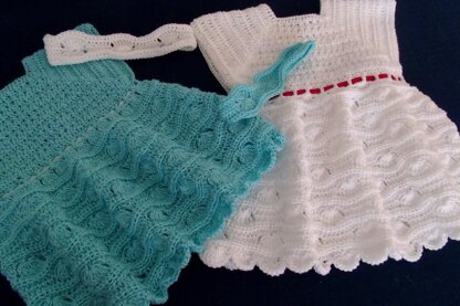 This textured dress (suitable for age 0-6 months) has a delightful ripple and fan pattern (waves and shells) and is worked from the neck down in one piece.