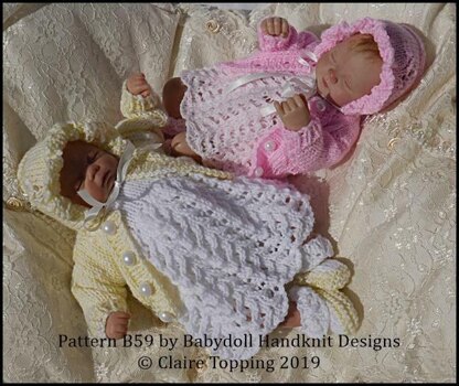 Knitting pattern for a lacy dress, cardigan, bonnet, pants and shoes. Cardigan, bonnet and pants feature a flower motif. Quick and simple to knit, this is a very pretty set for a doll.
