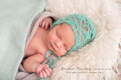 This sweet lacy bonnet pattern incorporates simple stitches in a lovely open work style that makes it ideal for newborn photography. It features a lovely fan-like shell patterning.