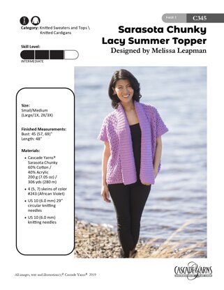 Lacy Summer Topper in Cascade Yarns Sarasota Chunky - C345 - Downloadable PDF is a free Intermediate Knitting pattern by Melissa Leapman, available as a Downloadable PDF and includes instructions in English. Super fun to make, this pattern could be your next masterpiece!