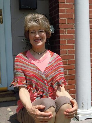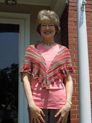 This shawl was designed by Ladawan. All our knitting group wanted to have the pattern, so I figured out what she did and wrote it out. It is a crescent shaped shawl with eyelet increase in the body and a ruffle on the end. It is a lovely flouncy little shawl. On the Ty-Dy one, I had to only do 9 rows on the ruffle. I, also, did M1 increase in place of all the YO’s to give it more of a solid look. I really like this version. I wish I had not run out of yarn on the ruffle. I had to bind off on a purl row. I bound off in knit to give it a textured edge on the right side. I was not sure how to block out the ruffled edge, but love the way the points make the yarn color scallop.