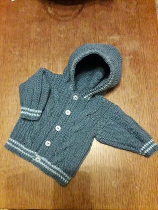 Baby hoodie, age 0-6 months, 18" chest Knitted in one piece to armhole, textured ladder design with cables, contrast detail in ribbing