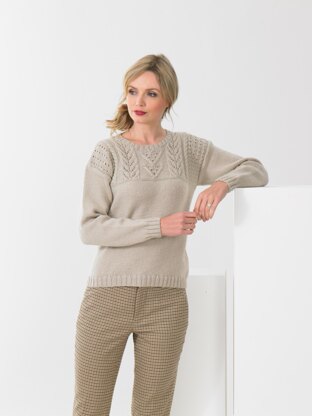 A simple stocking stitch sweater with upper bodice lace and cable detailing on front and back