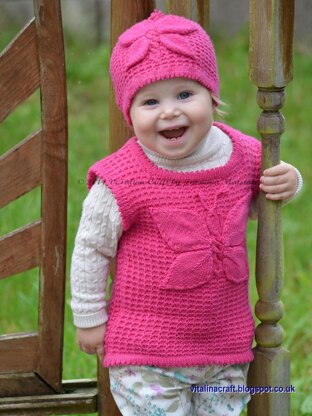 Lady Butterfly Vest is beautiful and stylish garment for your little one. The vest is fancy to knit and comfortable to wear. It is made in beautiful pink color with sport / 5-ply weight wool yarn. The vest knitted in textured pattern with beautiful butterfly at the front. A body of butterfly is cable and wings are applique. The butterfly is also decorated with seed beads. The bottom line of the vest as well as neckline and armholes are decorated with a fancy jagged edge.