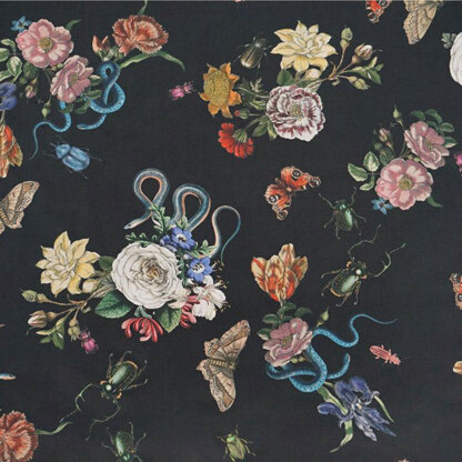 A Lovely Lady McElroy Cobra Corsage Cotton Marlie Lawn in Noir (Black) With Floral/Snake Pattern. Ideal for Shirts, Dresses, Blouses, Lampshades & Much More!\nThis fabric is sold by the meter (m) rather than by the yard so you get a little extra. 1 yard = 36” and 1 meter = 39.