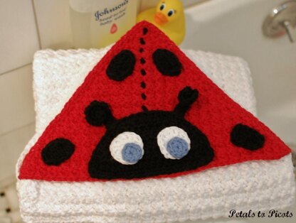 This ladybug hooded towel is not only cute and cuddly but oh so functional as well!! When worked in cotton yarn this textured stitch makes for a super absorbent towel that is sure to become any mom's favorite towel. Perfect gift idea for a baby shower or any new mom. The easy-to-follow pattern includes stitch counts at the end of each row/round and full color photos for ease of use. Written in American English according to Yarn Council standards and guidelines.