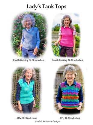 Truro tanktop: Sizes: 32-34-36-38 inch chest; Required: 200g-300g-300g-300g King Cole Homespun double knitting yarn; Needles: Metric3.25mm & 4mm; Tension: 22 stitches x 30 rows = 4 inches square, using 4mm needles and stocking stitch