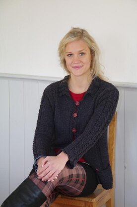 4 checked buttons; The edge of the right sleeve is crocheted in CC Jeans, the edge of the left pocket in CC Red. Three separate cables in the back, 3 cables together on the sleeves, one cable each at the front edges. Pattern written in German, but will soon be published in English