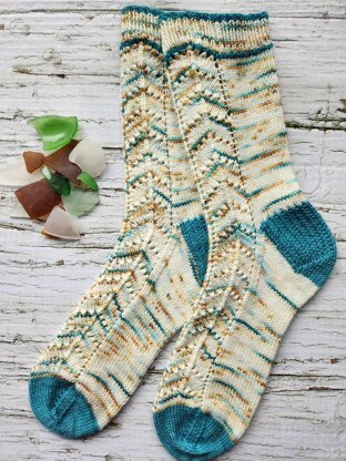 This fun lace pattern mimics the bubbles and froth as the waves hit the shore. It has the right amount of interest to keep you engaged in the knitting, but is easy to memorize. The fun is all on the front, so you can enjoy the look of the knit fabric on the back of the sock.