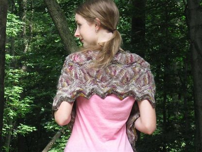 Five different yarns in one colorway are crocheted from the top down in a chevron pattern to create this textured, surprisingly lightweight shawl. Single crochet stitches are used for the three smoother yarns, while leggy treble crochet stitches highlight the distinctive qualities of the curlicue and mohair yarns. The result is a garment that's visually interesting and fun to make.