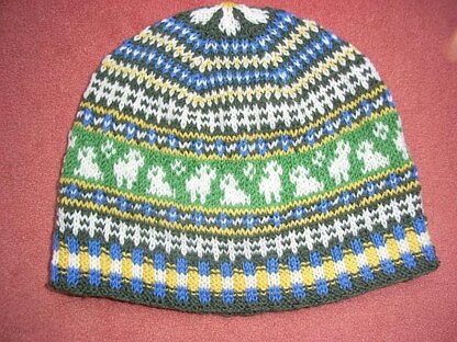 Another happy Easter and spring beanie idea. There is a band of two small different lambs (one sitting, one standing) all around this beanie accompanied by a fence and flower peerie pattern. At the top is a big daisy flower.
