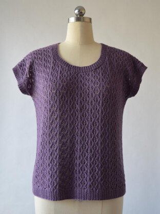 CONSTRUCTION: Back and front are knit separately from the bottom up and shoulders are joined with 3-needle bind off. Stitches are picked up for the ribbed neck band which is knit in the round. Sides are seamed and stitches are picked up for the armhole trims which are knit in the round and shaped at the underarm with decreases.