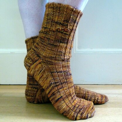 This toe-up sock begins as a simple ribbed sock. It finishes as a simple ribbed sock as well, it's what happens in between that's interesting! The transition from one style of rib to another forms a spiral around the sock, mirrored between the two.