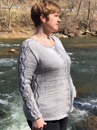 Yarn: Flying Goat Farm Alto (55% Superwash Bluefaced Leicester wool, 45% Silk, 260 yards/4 ounces) 4(4, 5, 5, 6, 7) skeins. Sample worked in Lightning.