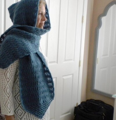 Crocheted hooded Scarf. Wrap yourself up with the Lani Hooded Scarf made in fluffy, soft, 80% acrylic/20% mohair yarn. One Size 68" circum x 11" wide. Skill Level: Easy. Crochet Hook: US H