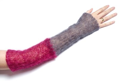 If you layer paint by working with watercolors or other thin layers, earlier layers shine through. That’s what happens with these mitts: You have two layers but neither covers the other fully. By working them separately, I can wear them covering much of my arm, even beyond my elbow.