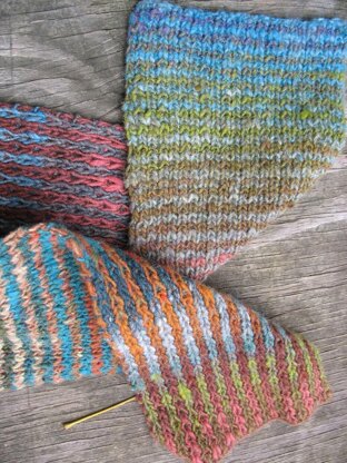 This pattern is incredibly easy—nothing more than knits, purls, and slipped stitches, with just one color used per row—but the end result will make even experienced knitters do a double-take: like magic, vertical stripes appear on one side of the fabric, and horizontal stripes on the other. The effects are accentuated by the use of two contrasting self-striping yarns. The fabric is reversible, of course, and lies flat.