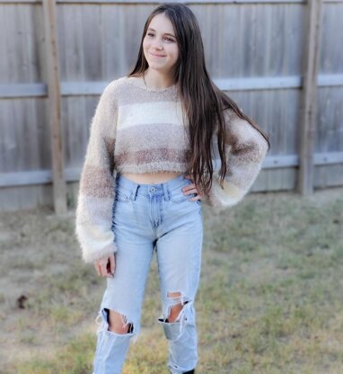 This pattern uses Caron Latte Cakes and makes a wonderfully soft and fluffy cropped sweater. You are welcome to use any yarn as long as it matches the gauge. But keep in mind, it may alter the finished look of the sweater.