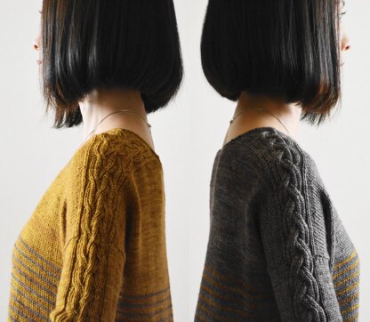 It is a comfortable pullover knitted from the top-down in one piece. At first, the right and left saddle shoulder panels are worked separately, then stitches are picked up for the back and front from the edges of the right and left shoulder. German short rows are used to shape the shoulders. The front and back of this pullover are worked back and forth separately to the underarm, then are joined together to continue in the round in one piece. After joining the body and shaping the underarm, striping is started. Sleeves are worked top down in the round after the body is finished. Both versions have the same stitch count, but different stitch gauges, hence the finished measurements are also a little different.