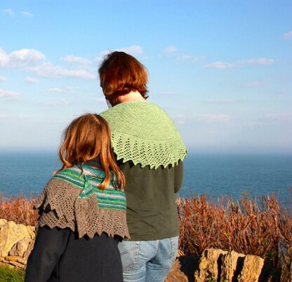 Perfect for some luxurious fingering weight or special handspun you've been saving, this cozy shawl combines the comforting mindlessness of garter stitch with a geometric lace border for interest. The pattern is easily adaptable to accommodate any weight or amount of yarn available, and the resulting shawl is warm, cozy, and gorgeous. After the garter stitch body of the shawl is finished, the openwork edging is worked sideways, incorporating the live body stitches to give a seamless finish. Small sample shown was worked in The Fibre Company Canopy fingering (50% alpaca/30% merino/20% bamboo); large two-colour sample worked in 2-ply fingering weight handspun Shetland.