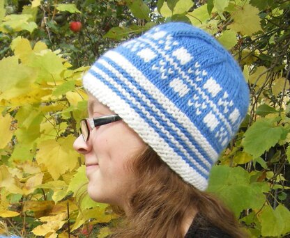 Simple Latvian designs decorate the upper part of the hat. These small designs add a special touch and are a great way to practice your stranded knitting without committing to a big project.