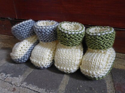 These lovely booties are a quick knit with a cuff design that helps them stay put! They have a garter stitch sole and sides, a stocking stitch instep and a ribbed cuff with a garter stitch fold-over. The booties are knit using two colours, however you could make them in one colour only by ignoring the colour changes! They are knit flat on two needles with only one seam.