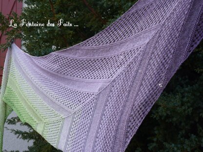 Le châle Lavandin est de forme asymétrique, c’est un subtil assemblage de jersey et point fantaisie. Il commence par une des pointes.
