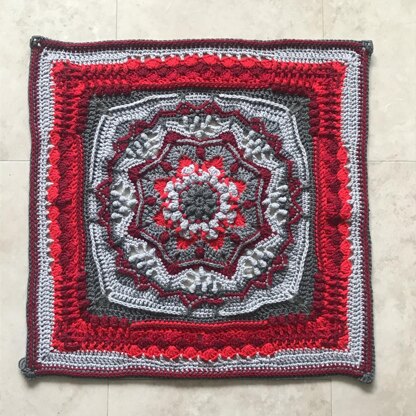This square is designed to be a central focus for an afghan / blanket surrounded by other squares which meet the standard 12 inch worsted weight definitions. As such the final stitch count is 79 stitches per side (= 39 sts x 2 squares, + 1 st for the join).