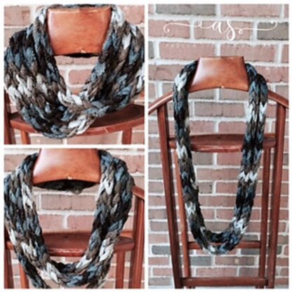 Uses one skein of Ruffle type of yarn (or less, depending on yardage and how long you want it). Do not unravel yarn to use as traditional ruffle yarn; keep it folded together to use as a bulky yarn.
