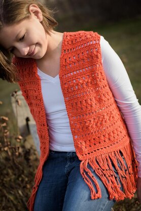 Your tween girl will make the ultimate fashion statement in this lacy vest crocheted from I Love This Cotton yarn in her favorite color. Cluster stitch pattern gives it a flower-petal appearance. She can pair it with her favorite jeans and shirt for a great spring or fall look.