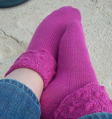 A simple sock with a pretty lace fold down cuff and stocking stitch foot, knit in the round from cuff to toe. Starting with the lace cuff, then a ribbed ankle section (hidden behind the cuff when worn), a slip stitch rib heel followed by a dutch heel turn and rounded toe.