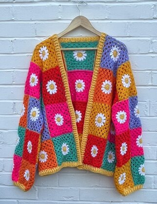 The Lazy Daisy cardigan is fun to make and wear!! Constructed from daisy granny squares with a decrease at the cuff and rib edging, the pattern includes sizes Xs (70cm/27in) up to 6XL (170cm/67in). The pattern explains how to make it in a solid colour or in the multicoloured version.