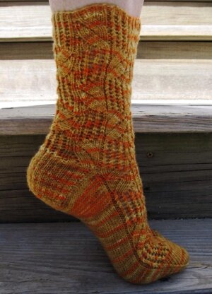 Open mesh and stylized leaves combine to create light and playful socks. Worked from the top down, socks feature a gently waving ribbed cuff, round heel, and wedge toe. A basic knowledge of top down sock construction is helpful.
