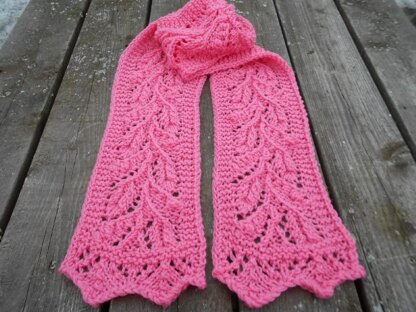 A fancy leaf with buds decorates this lacy scarf! It has a delicate look but remains sturdy if knitted in worsted weight yarn. It would look even lovelier if you used a pale green yarn to evoke springtime! There is a chart as well as written instructions to knit this scarf.