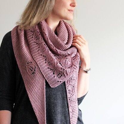 This modern triangular shawl features the loveliest little leaves floating on a garter stitch background to finally meet in a beautiful all-over lace motif.