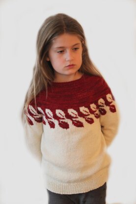 Leafs child sweater is a circular yoke sweater worked top down and in one piece. It has a very easy stranded pattern of leafs on the top-half of the sweater. It’s so easy, even new beginners to stranded work can make this. Made in sport-weight, this is a light weight sweater, thick enough to keep your child warm, all through winter. It has a little bit of positive ease so the fit is away from the skin, helping those children most sensitive for itching and also making it more comfortable to wear.