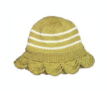 This is a sweet sunhat type cap for a child. It will fit an 18" to 20" head circumference and is knitted from soft Debbie Bliss Merino DK. I used green and off white, but you can use whatever colors strike your fancy!