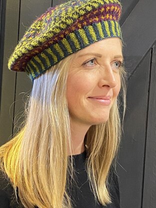 This beret is knitted in the round using a simple fair isle design with a two tone rib. The pattern comes with a chart that corresponds to the colours used. There are 5 colours and you will need 5 x 25g balls.