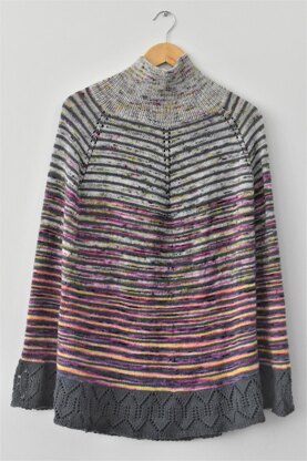 Lee is a top-down poncho knit in the round. I used the traveling stripes technique of creating jogless stripes. The poncho is worked in six sections and finishes with a lace border and a little bit of ribbing at the bottom.