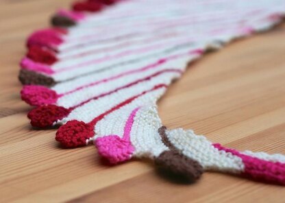 You start with three stitches, adding wider and wider rows and forming a long and narrow triangle. The little leaves in contrast colours are formed by short rows that are explained in the pattern. This pattern is very flexible: You can use any amount of yarn and end up with a small neckerchief, a small or bigger shawlette. The shawlette in the pictures used 165g of Wollmeise Pure 100% (ca. 130g in main colour plus 5-7g of each of six different colours of contrasting leftovers). An alternative is suggested below.