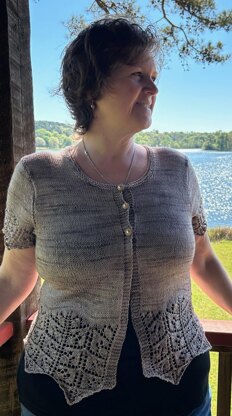 This cardigan has a deep lace hem and lace at the sleeves. This light, leafy lacy cardigan is made from a beautifully light fingering weight, so it’s great for spring through fall. The name is the Italian word for the colorway name, Driftwood.
