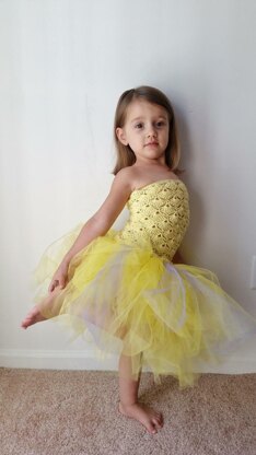 Skill level: advanced beginner to intermediate. Finished dimensions: sized for 3-5 years old girls (chest circumference 20-21 inches) Materials: Yarn: Baby weight yarn. About 2 oz of Yellow. Tulle: 2 Yellow Tulle Spools, 1 Light Purple Tulle Spool (each spool is 25 yd/ 23 of 6"/15 cm wide tulle). Thin elastic 19 inches. 3 little buttons. Hook: hook F5 (3.75 mm) or size to obtain gauge **Ga